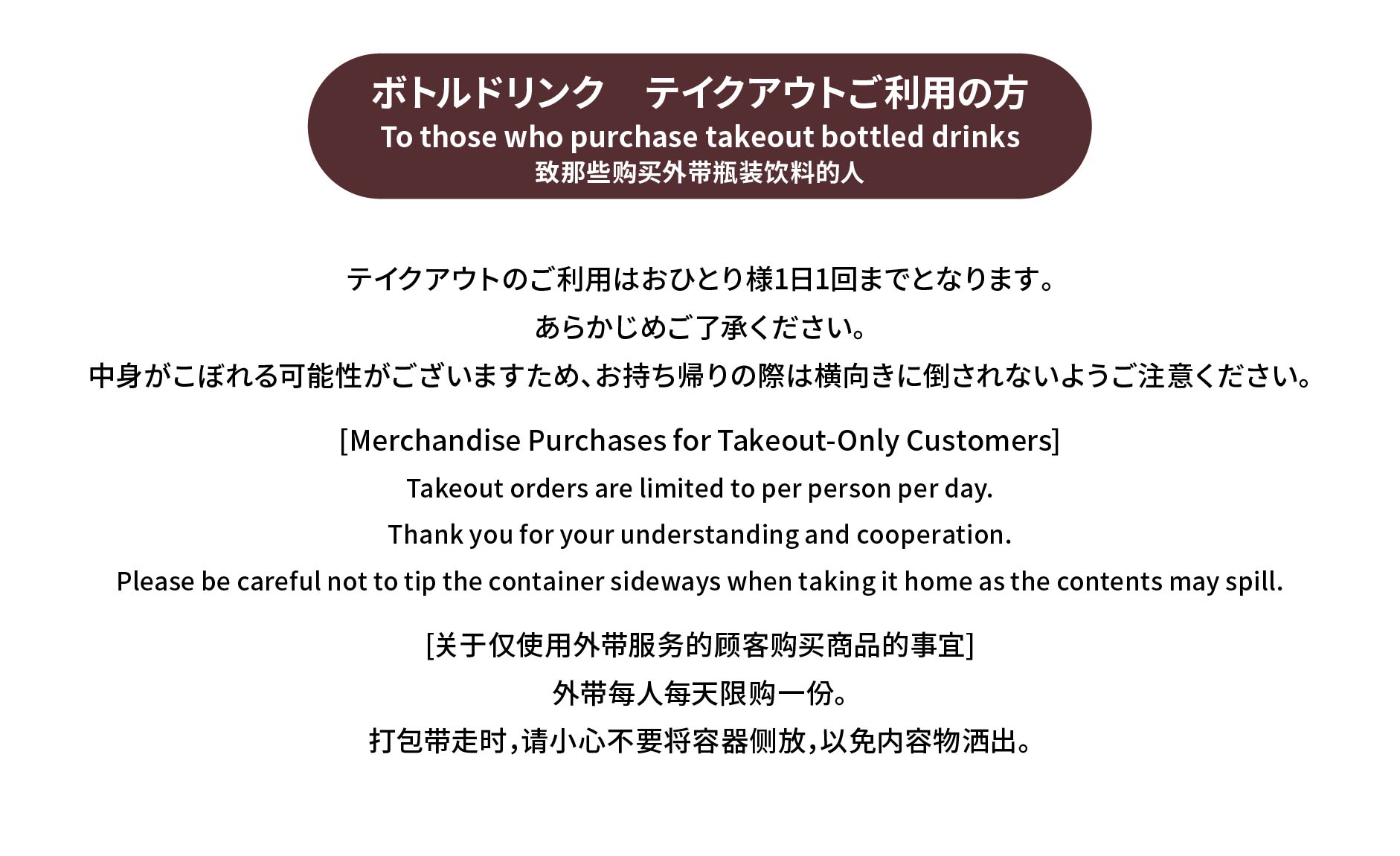 中身がこぼれる可能性がございますため、お持ち帰りの際は横向きに倒されないようご注意ください。