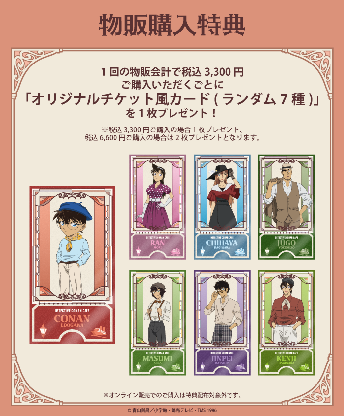 1回の物販会計で税込3,300円ご購入いただくごとに「オリジナルチケット風カード(ランダム7種)」を1枚プレゼント。